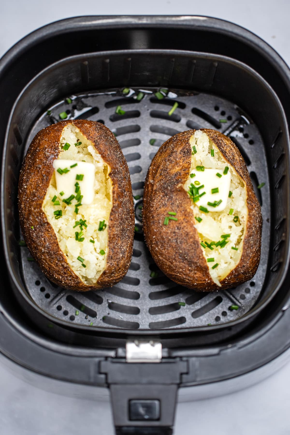 Baking potatoes in the oven is an easy way to make a large batch of baked potatoes at one time, but the air fryer is better at giving the baked potato a crispy skin, and cooks a little bit faster.