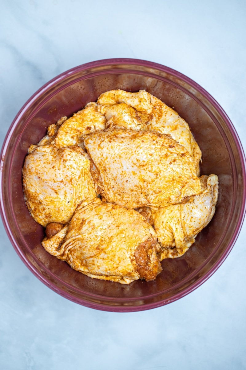 - In a medium bowl, add olive oil and spices and whisk until everything is combined. Use a paper towel to pat the chicken thighs dry.
