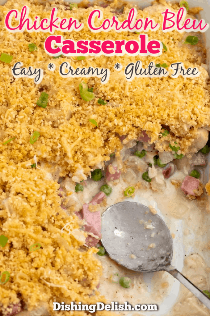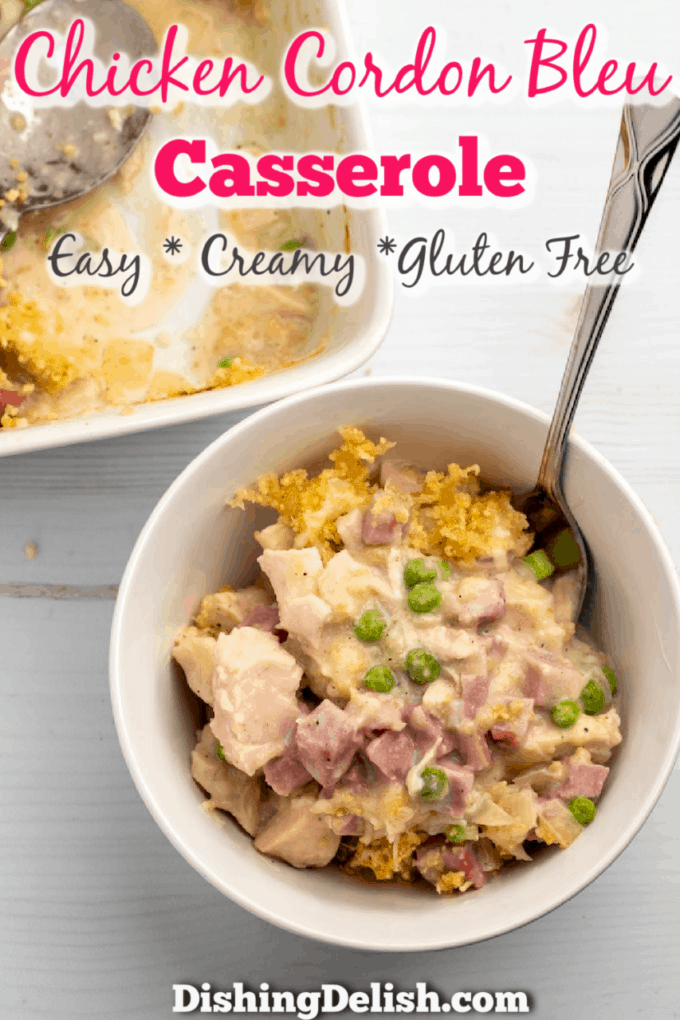 Chicken Cordon Bleu Casserole is a quick and easy weeknight dinner, made with chicken, ham, and peas in a savory cheesy sauce and topped with swiss cheese and crispy bread crumbs, ready in under 45 minutes!
