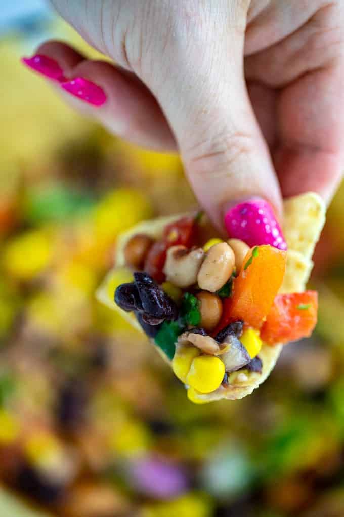 Cowboy Caviar is one of my FAVORITE party dips, made with pantry ingredients like beans and corn, mixed together with some fresh bell peppers, tomatoes, and onions, tossed with a tangy dressing. You can serve this with tortilla chips, or put it out as a side salad for a potluck or BBQ. Plus, you can make cowboy caviar from common pantry ingredients, making it easy to throw together last minute or when you’re running low on groceries and don’t want to make a trip to the store. I like to serve cowboy caviar with BBQ Chicken Drumsticks or Smoked BBQ Ribs. Cowboy Caviar is vegan, gluten free, and the PERFECT healthy side dish!