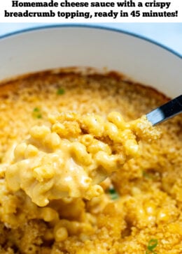 - In a separate bowl, combine the breadcrumbs and parmesan cheese. Add melted butter and stir everything together. Add evenly to the top of the mac and cheese, then bake uncovered for 20-25 minutes, or until topping is golden brown. If you want a crispier topping, turn the broiler on for 1-2 minutes, watching closely so it doesn’t burn.