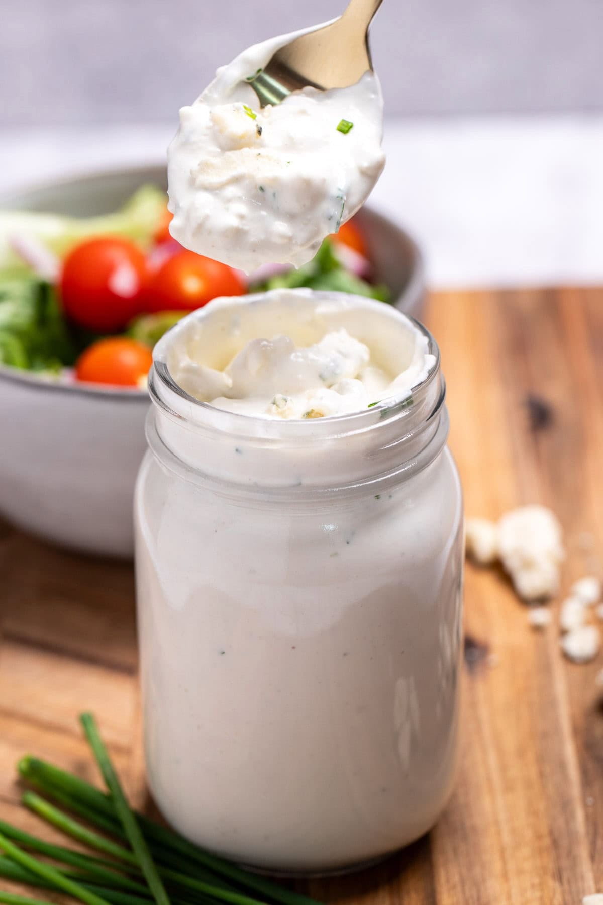 Tangy, rich, and incredibly creamy, this homemade blue cheese dressing is the perfect side for salad greens, buffalo hot wings, fries, you name it! Made with wholesome ingredients like buttermilk, blue cheese, fresh chives, and sour cream, it’s the ultimate upgrade to your regular dishes. Best of all, it comes together in less than 5 minutes, with no crazy steps, and makes an entire jar of dressing!