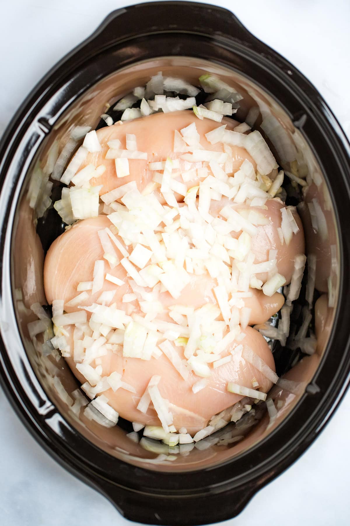 Place the raw chicken breast in the slow cooker. Add the chopped onion on top of the chicken.
