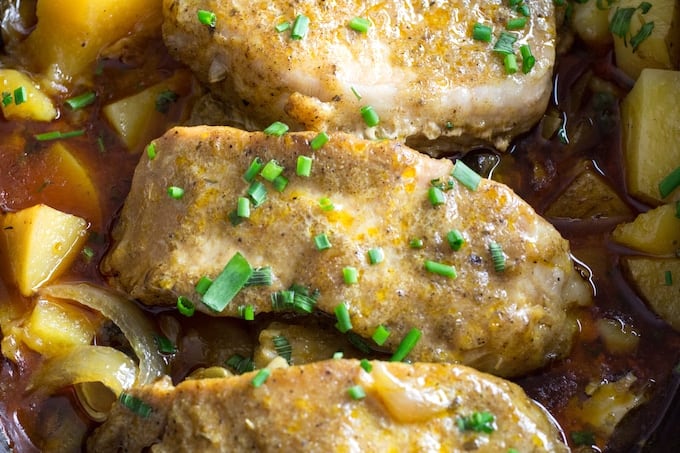 Slow Cooker Pork Chops & Potatoes is a really simple recipe that tastes like it took all day to make. Just throw the pork chops in and let the slow cooker work its magic!